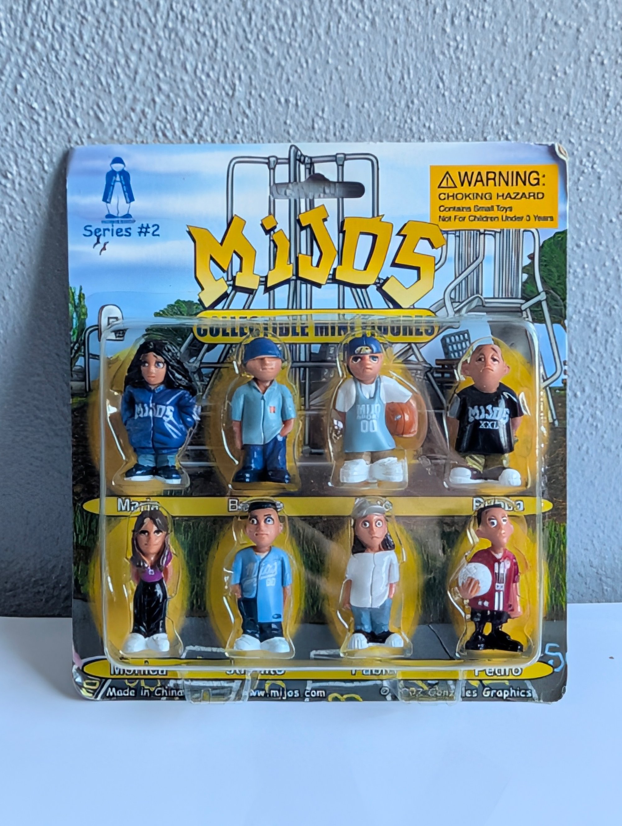 Original MIJOS Series #2 collectible mini figures 8-pack, still on the original blister card. These stylized figures are based on the early-2000s “MIJOS” characters—Latino kids who hang out at Mijos Park, playing sports, sharing stories, and getting into harmless mischief.